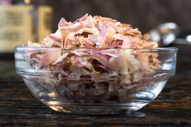 Coarsely dehydrated red onion flakes for soups, snacks, and seasoning.