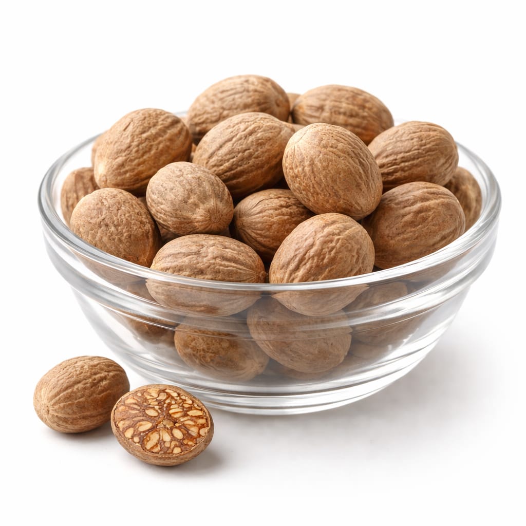Round premium nutmeg with sweet, warm aroma — export quality.